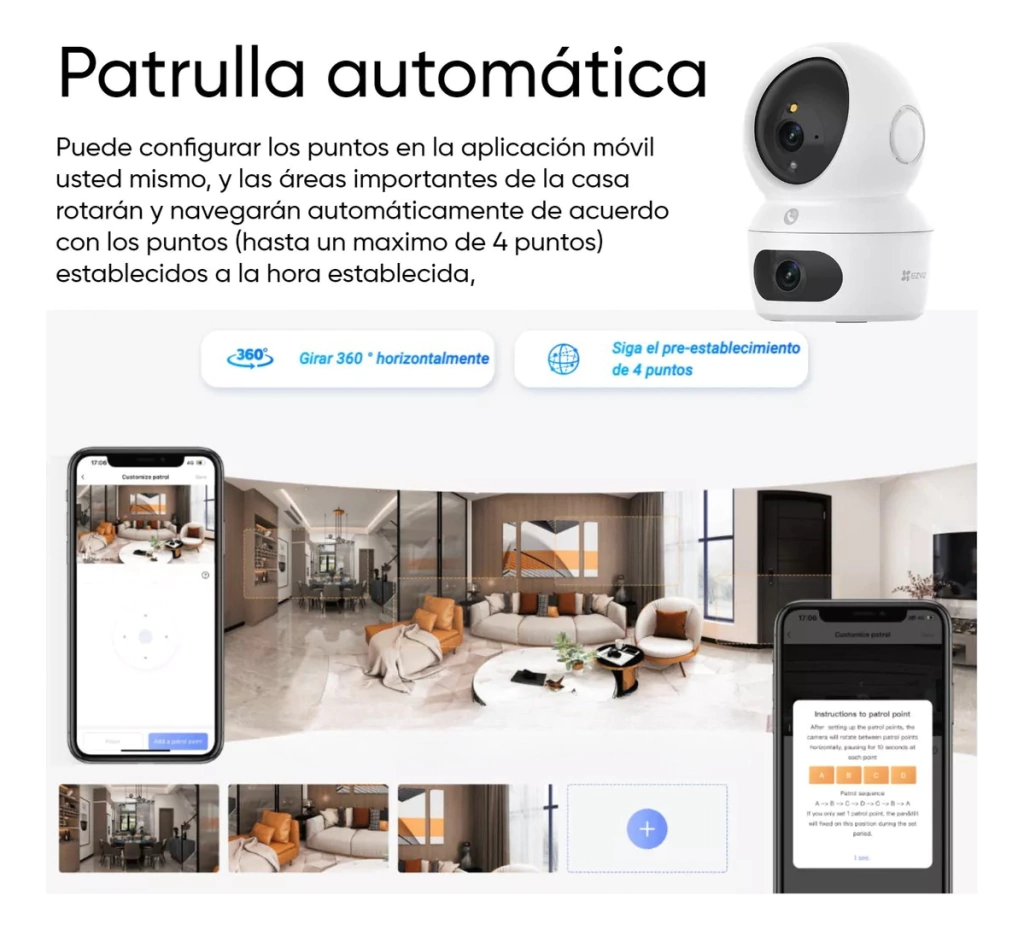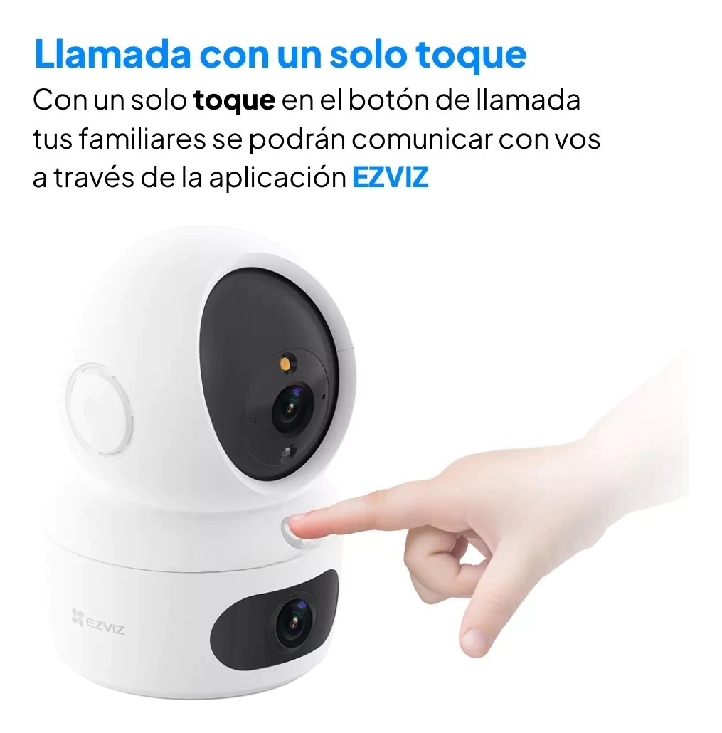 Control de un toque para cambiar la vista vinculada - Dos modos de patrulla para seguridad automática - Modo de suspensión para la protección de la privacidad - Admite Wi-Fi 6 de doble banda (2,4/5 GHz) - Integración inteligente con Google Assistant y Amazon Alexa - Admite tarjeta MicroSD (hasta 512 GB) y almacenamiento EZVIZ CloudPlay - Tecnología de vídeo H.265 Lentes duales. Doble protección. Con la exclusiva tecnología de doble lente Dual ofrece una protección de nivel superior que normalmente se consigue con una configuración de varias cámaras.