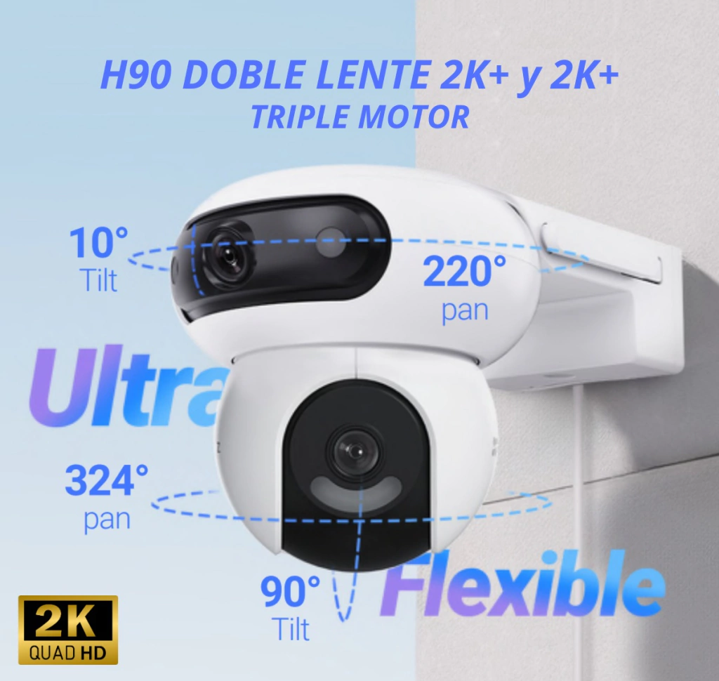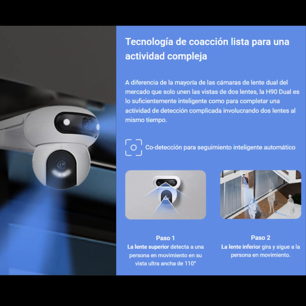 Cámara de Seguridad EZVIZ H90 Dual 2K+ con Visión 360 y Doble Lente La EZVIZ H90 Dual es una cámara de vigilancia de última generación que ofrece una cobertura completa gracias a su diseño con doble lente rotativa. Ideal para hogares, negocios o espacios amplios que requieren monitoreo continuo sin puntos ciegos.