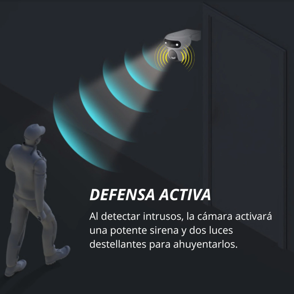Características destacadas: Doble lente motorizada con rotación independiente para cobertura de 360 grados. Resolución 2K+ (4MP) en ambas lentes para una imagen clara y detallada. Visión nocturna en color con alcance de hasta 40 metros. Detección inteligente por IA para identificar personas y vehículos, reduciendo falsas alarmas. Sistema de defensa activa con sirena y luces estroboscópicas al detectar intrusos. Audio bidireccional para comunicarte en tiempo real o configurar mensajes automáticos. Resistencia al clima con certificación IP67, ideal para interiores y exteriores.